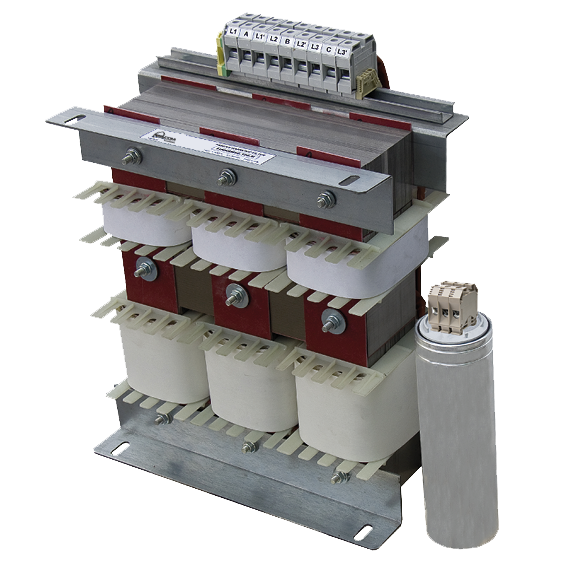 The filters consist of a combination of inductor (filter inductor) -capacitor inserted in derivation from an asymmetrical series inductor (main inductor). The performance of the passive harmonic filters Esscom PHF series are very high: they reduce the harmonic distortion in current from 100% of THDi to typical values lower than 5%; the filters are made up of capacitors that form a resonant circuit with a reactor that has a high impedance path at the fundamental frequency and a low impedance path at higher specific frequencies.